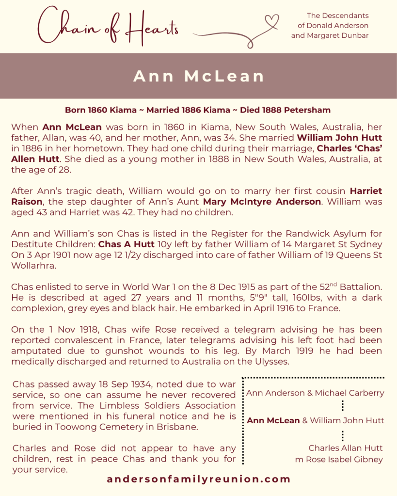 Ann McLean, the second of Ann Anderson’s children with her second husband Allan McLean. Ann would also tragically pass away leaving a young son and husband to mourn her loss. This week we also follow the sad story of that son Charles ‘Chas’ Allen Hutt, who would go on to serve in World War 1.