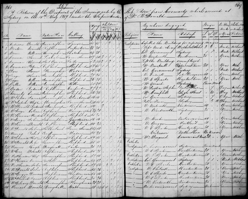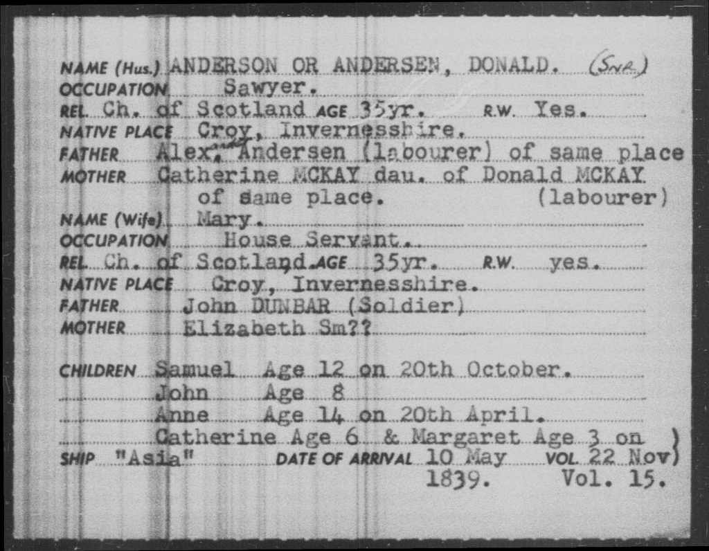 A Return of the Disposal of the Immigrants by the ship Asia from Cromarty which arrived at Sydney on the 10th May 1839 under the Superintendent Dr McDonald stated that Donald Anderson, a sawyer from Invernesshire, aged 33, was expelled from the buildings for refusing wages. His religion was listed as being Presbyterian. An alphabetical list of the Emigrants by the ship Asia from Cromarty to Sydney; 17th September 1838 to 10th May 1839 listed Donald as being aged 34, Margaret (33), Ann (12), Samuel (10), John (7), Catherine (5) and Margaret (3). As stated above, Donald and Margaret were married at Dalcross, in Inverness on the 13th of January 1826, some thirteen years prior to their arrival in the colony. Their family were: