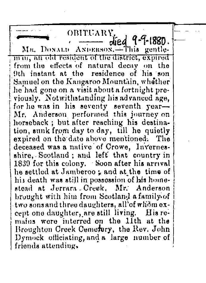 This gentleman, an old resident of the district, expired from the effect of natural decay on the 9th instant at the residence of his son Samuel on the Kangaroo Mountain, wither he had gone on a visit a fortnight previously. Notwithstanding his advanced age, for he was in his 77th year, Mr Anderson performed his journey on horseback, but after reaching his destination sunk from day to day till he quietly expired on the date above mentioned. The deceased was a native of Croy, Inverness, Scotland. He left that country in 1839 for this colony. Soon after his arrival, he settled at Jamberoo and at the time of his death was still in possession of his homestead at Jerrara Creek. Mr Anderson bought with him from Scotland, a family of two sons and three daughters, all of whom except one daughter are still living. His remains were interred on the 11th at Broughton Creek Cemetery, the Rev John Dymock officiating and a large number of friends attending.