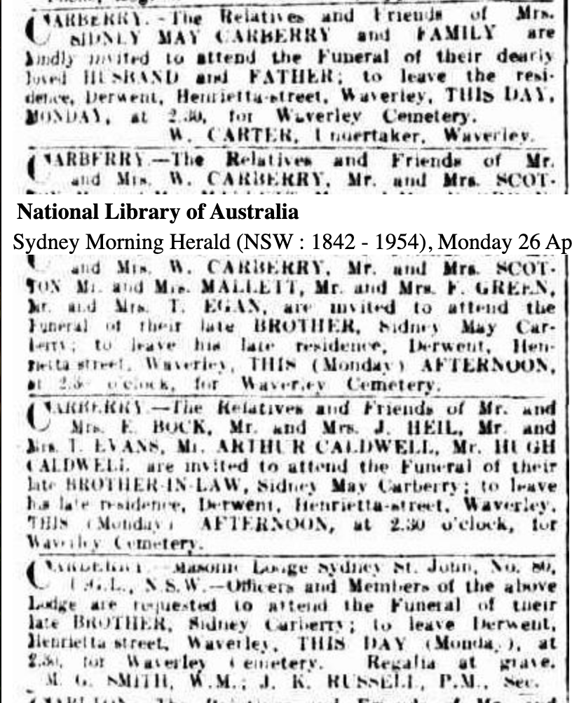 When Sidney May Carberry was born in 1879 in Tenterfield, New South Wales, his father, Francis, was 29 and his mother, Elizabeth, was 27.