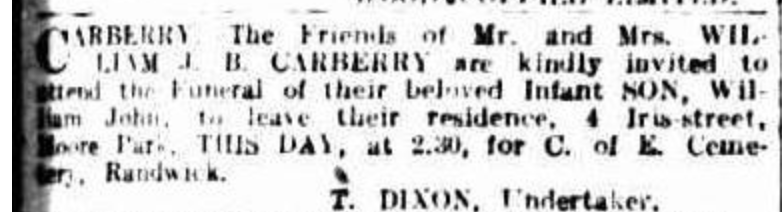 When William John Benson Carberry was born on 13 February 1877 in Casino, New South Wales, his father, Francis, was 26 and his mother, Elizabeth, was 24.