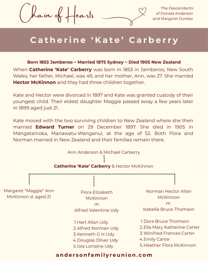 Catherine was baptised shortly after her birth in 1853, but the records are too pale to read, making them illegible (V1853249870). She was married to Hector in 1875 at Sydney, NSW (ref.234). Records show they had a family of three children, as follows: