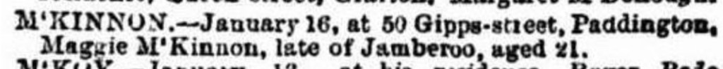 1899 ‘Family Notices’, The Sydney Mail and New South Wales Advertiser (NSW : 1871 – 1912), 21 January, p. 177. , viewed 28 Apr 2025, http://nla.gov.au/nla.news-article1652294871899 ‘MISS MAGGIE McKINNON.’, The Shoalhaven News and South Coast Districts Advertiser (NSW : 1891 – 1937), 21 January, p. 4. , viewed 17 May 2025, http://nla.gov.au/nla.news-article135732400