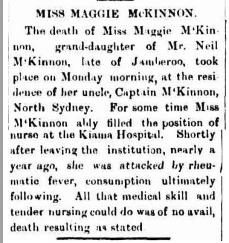 1899 ‘DEATH OF MISS MAGGIK McKINNON.’, The Kiama Independent, and Shoalhaven Advertiser (NSW : 1863 – 1947), 17 January, p. 2. , viewed 17 May 2025, http://nla.gov.au/nla.news-article101660039