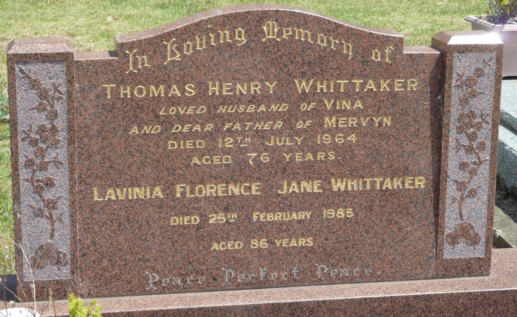 When Lavinia Florence Jane Young was born in 1898 in Jamberoo, New South Wales, her father, Robert, was 26, and her mother, Barbara, was 20. She married Thomas Henry Whittaker in 1948 in Sydney, New South Wales. She died on 25 February 1985 in Kiama, New South Wales, at the age of 87, and was buried there.