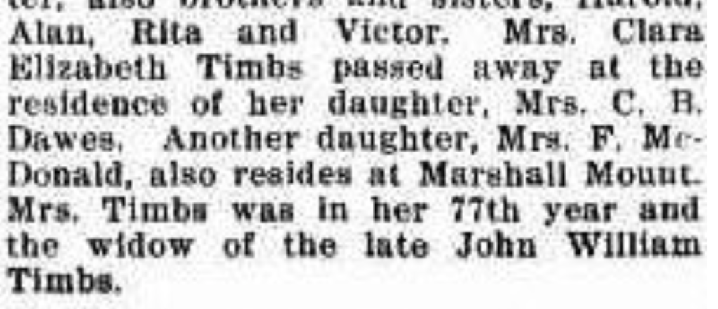 On l3 Dec 1896 John William Timbs died unexpectedly leaving his young widow, Clara with 5 young girls to raise. Clara’s father-in-law, Henry Timbs lived with Clara and the girls until his death in 1899. After Clara’s mother died in 1904 she brought her father, Charles Langley to Marshall Mt to live until his death in 1917. They continued to farm Lot 7 until 1912 when Maude Timbs married Caleb Dawes and the family moved down Calderwood Rd to where the Dawes farm is still today.