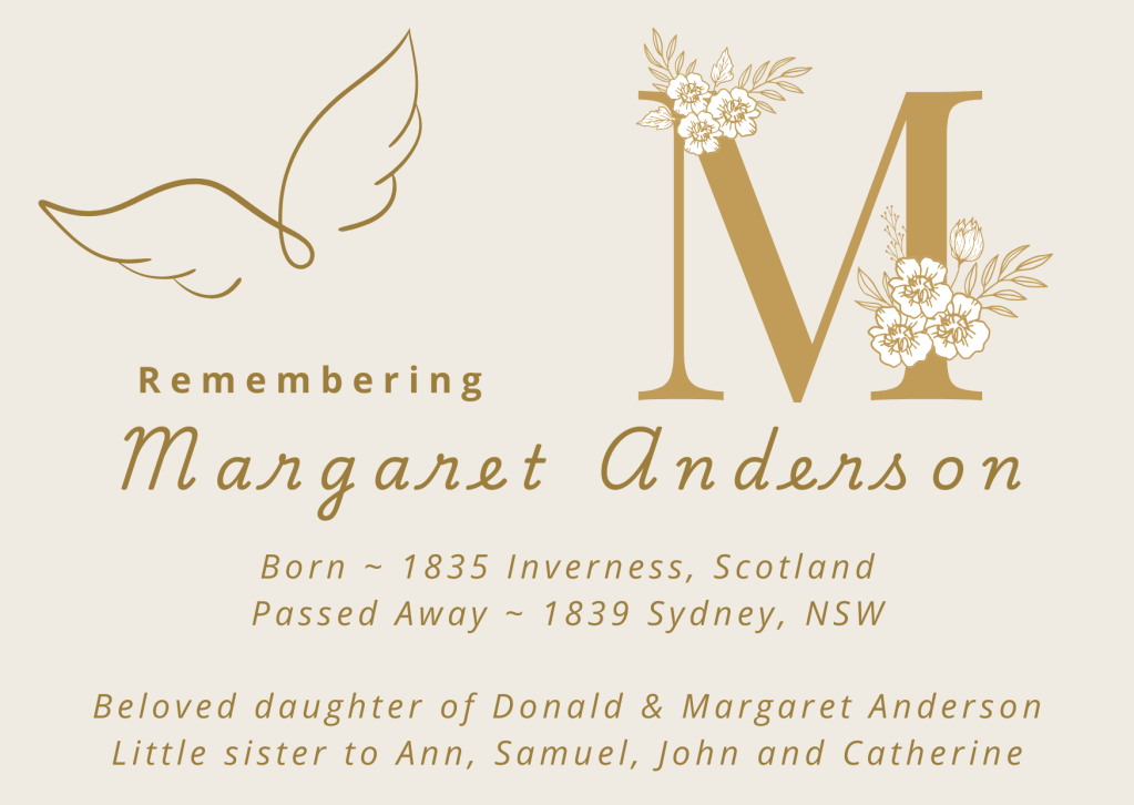 The year after the family arrived in Sydney, young Margaret passed away in 1840. Her death is recorded in the Australia, Death Index, 1787-1985. We do not know what caused her to pass, but can only imagine how tragic it must have been for her family to lose her.