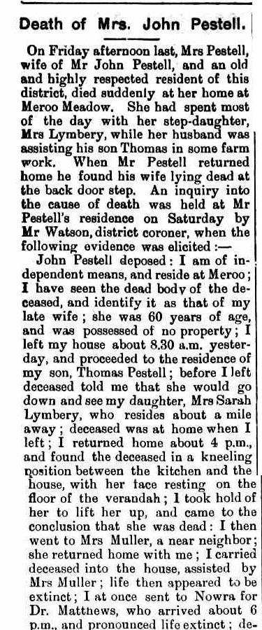 1911 ‘Death of Mrs. John Pestell.’, The Shoalhaven Telegraph (NSW : 1881 – 1937), 3 May, p. 11. , viewed 13 Jul 2025, http://nla.gov.au/nla.news-article127192763