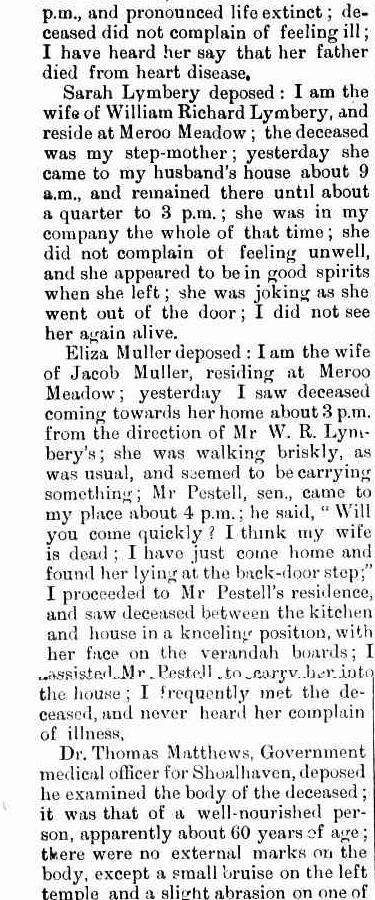 Sarah returned to the South Coast and on the 10th September 1890 married John Pestell, the son of Joseph and Catherine PESTELL. Sarah died at Meroo on the 28th April 1911 and John later died in 1914 at Nowra.