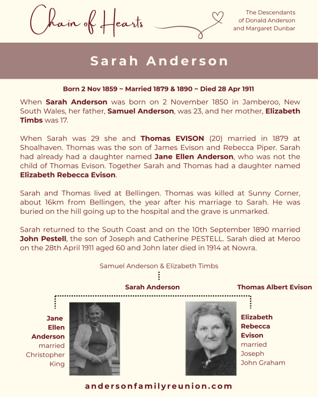 Sarah and Thomas EVISON married in 1879 at Shoalhaven. Thomas was the son of James Evison and Rebecca Piper. Sarah had already had a daughter named Jane Ellen Anderson, who was not the child of Thomas Evison. Together Sarah and Thomas Evison had a daughter named Elizabeth Rebecca Evison.