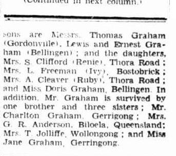 Elizabeth Rebecca Evison and Joseph John GRAHAM were married in 1898 at Berry, NSW. Joseph was the son of John GRAHAM and Eliza Wilson. They were to have a family of five girls and four boys. Some of these were born on the South Coast, the family later moved to Rouse Hill on the Richmond River and later to Gordonville on the Bellinger River. Their children were as follows: